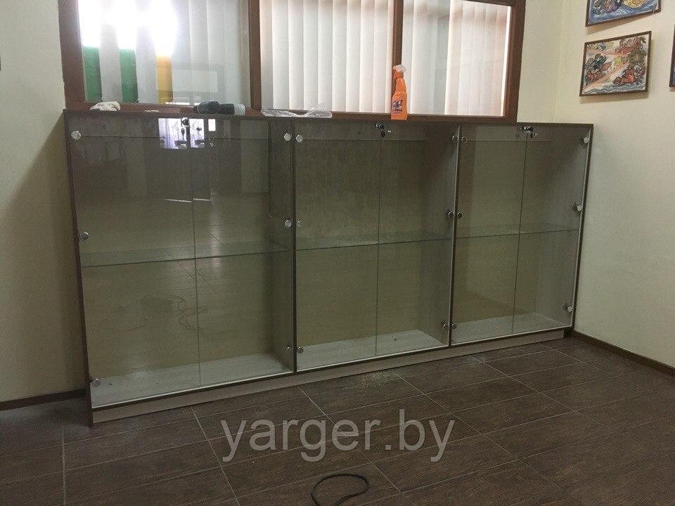 Стелаж со стеклянными полками и дверками с замками, в детский садик, по чертежу клиента.