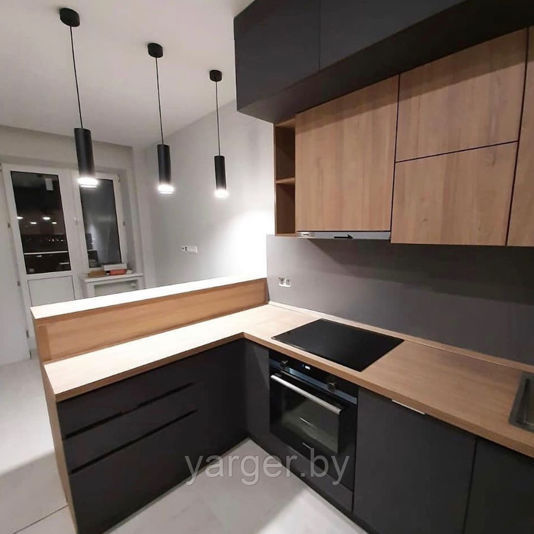 Данный кухонный гарнитур станет идеальным дополнением интерьера в стиле лофт или хай-тек. Данная модель кухни – модный тренд, максимальная практичность и синоним хорошего вкуса. Универсальный цвет смотрится выигрышно при любом освещении, его можно сочетать с любым оттенком и фактурой. Гарнитур имеет угловую конструкцию. По бокам размещены колонки под холодильник и систем хранения. Остров с открытыми полками можно использовать для зонирования пространства.